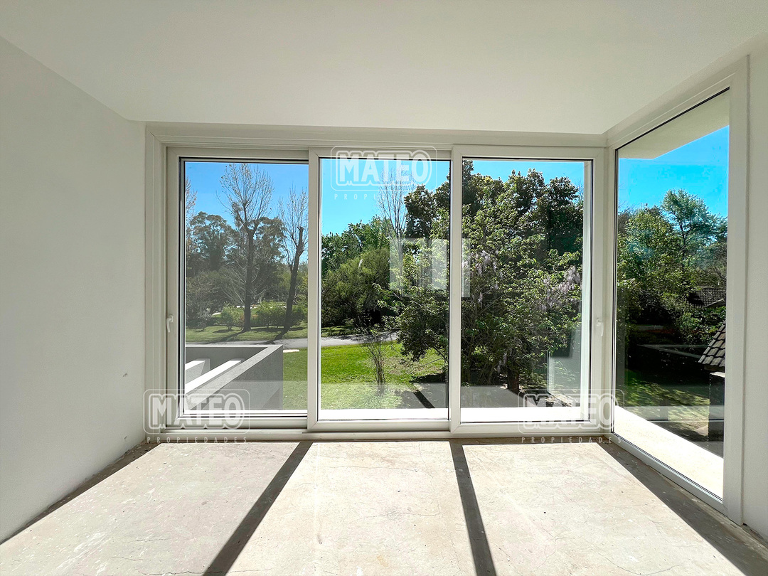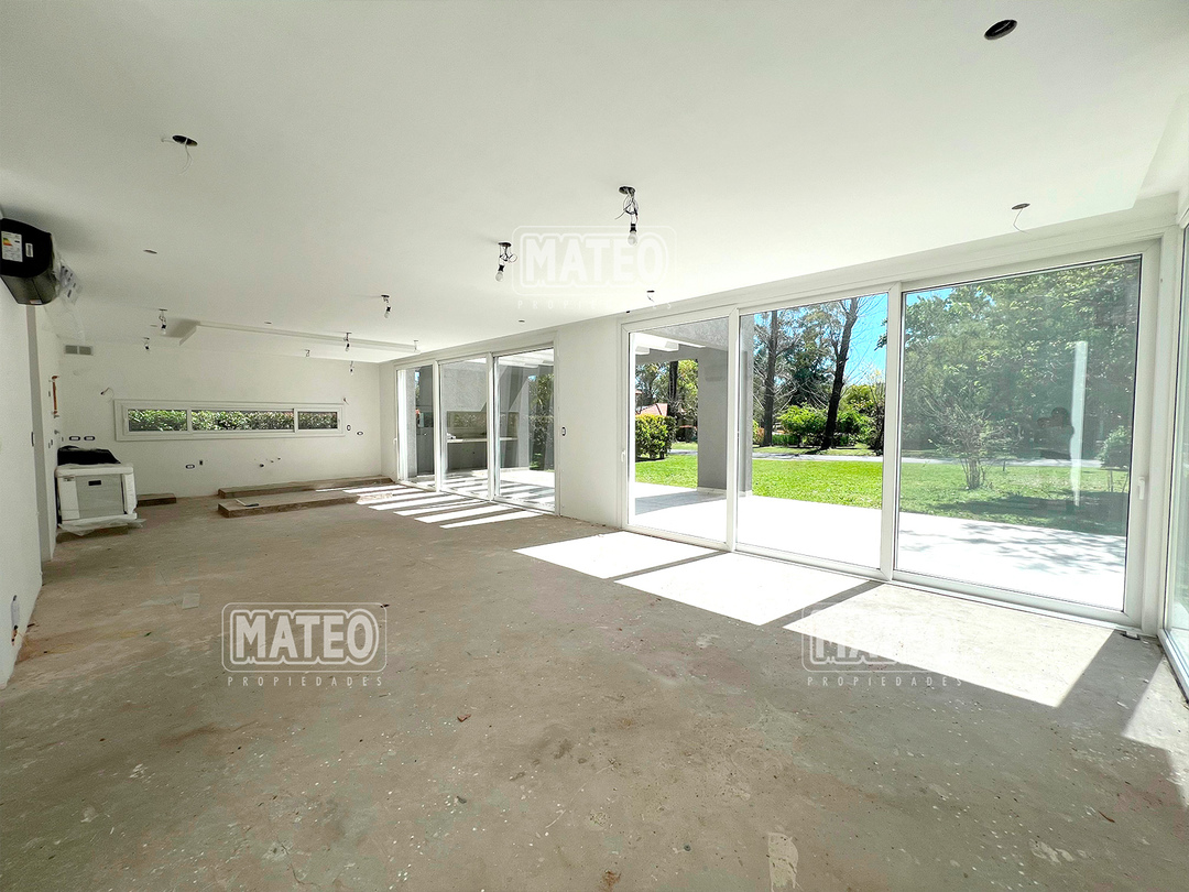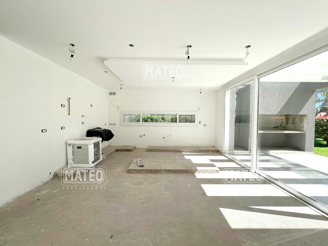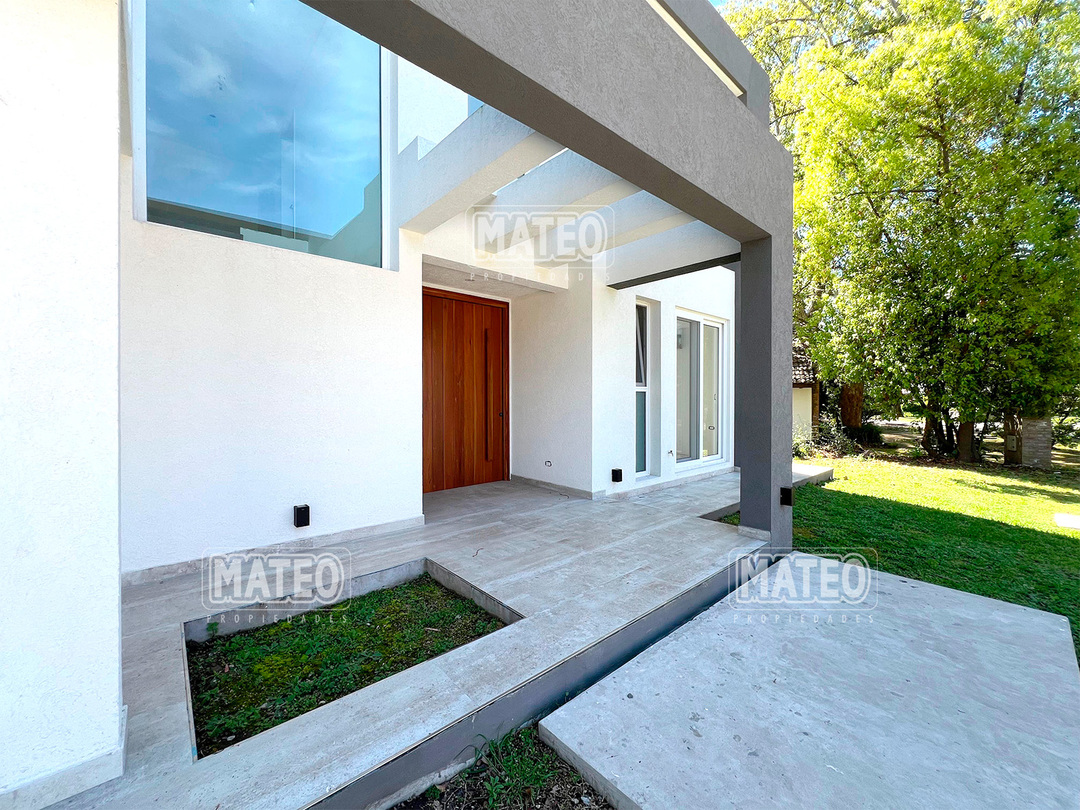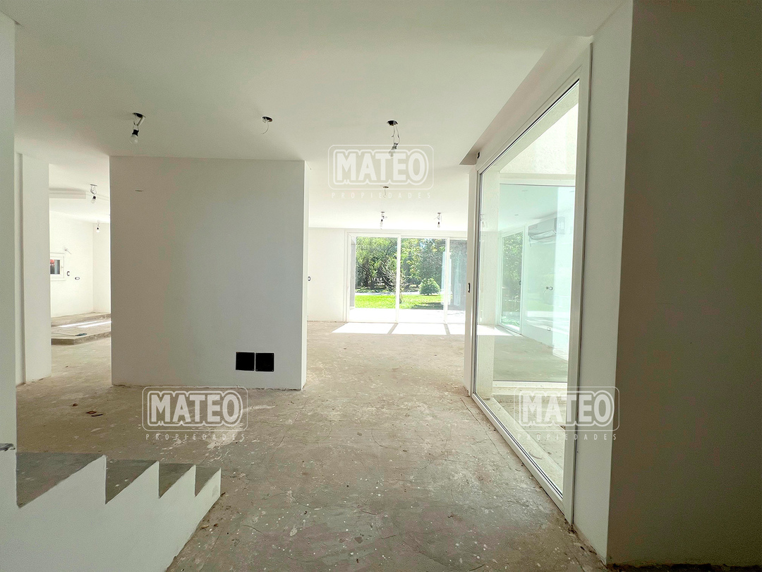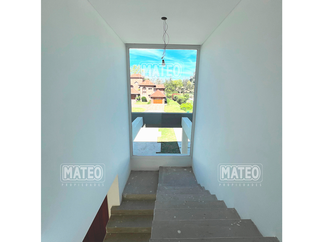 La propiedad se vende con algunos de sus revestimientos sin colocar. PLANTA BAJA: Hall de recepción. Living comedor con amplios ventanales hacia el jardín. Cocina integrada, diseñada para amplia isla central. Estudio. Baño completo. Cómodo lavadero interno. Gran galería con parrilla. Baño externo. Garaje cubierto para dos vehículos, a lo que se adiciona espacio descubierto para varios vehículos. Cuarto de guardado. PLANTA ALTA: Dormitorio principal con grandes ventanales y vistas abiertas, cuenta con espacio de estar o estudio, amplio espacio de vestidor, luminoso baño suite preparado para hidromasajes, box de ducha, y doble bacha. Segundo dormitorio en suite con dos sectores de vestidor. Tercer dormitorio en suite con vestidor. CARACTERISTICAS GENERALES: La propiedad cuenta con aberturas PVC doble vidrio, puertas internas Oblak, destacadas puertas de madera al frente, splits frio-calor inverter espejados en todos sus ambientes colocados. Caldera Peisa instalada, y dos termotaques (planta baja y planta alta). Revestimiento exterior de tarquini. Pisos exteriores colocados. La propiedad se vende sin la colocación de sus pisos interiores, amueblamiento de cocina, sanitarios y vanitory de sus baños, amueblamiento de vestidores, ni la colocación de los radiadores. Mateo Propiedades. Mat. 36 Dpto. M-Gr.38