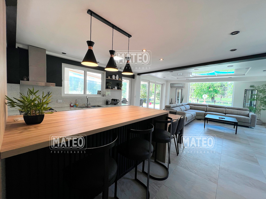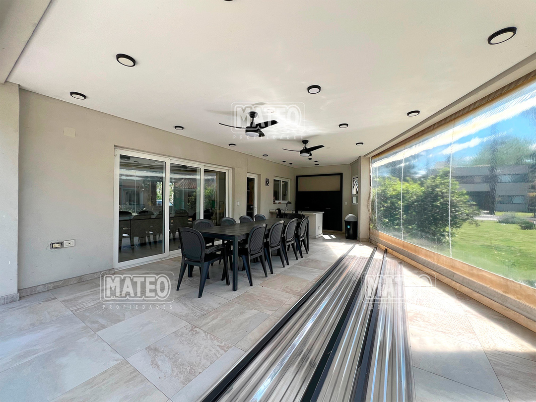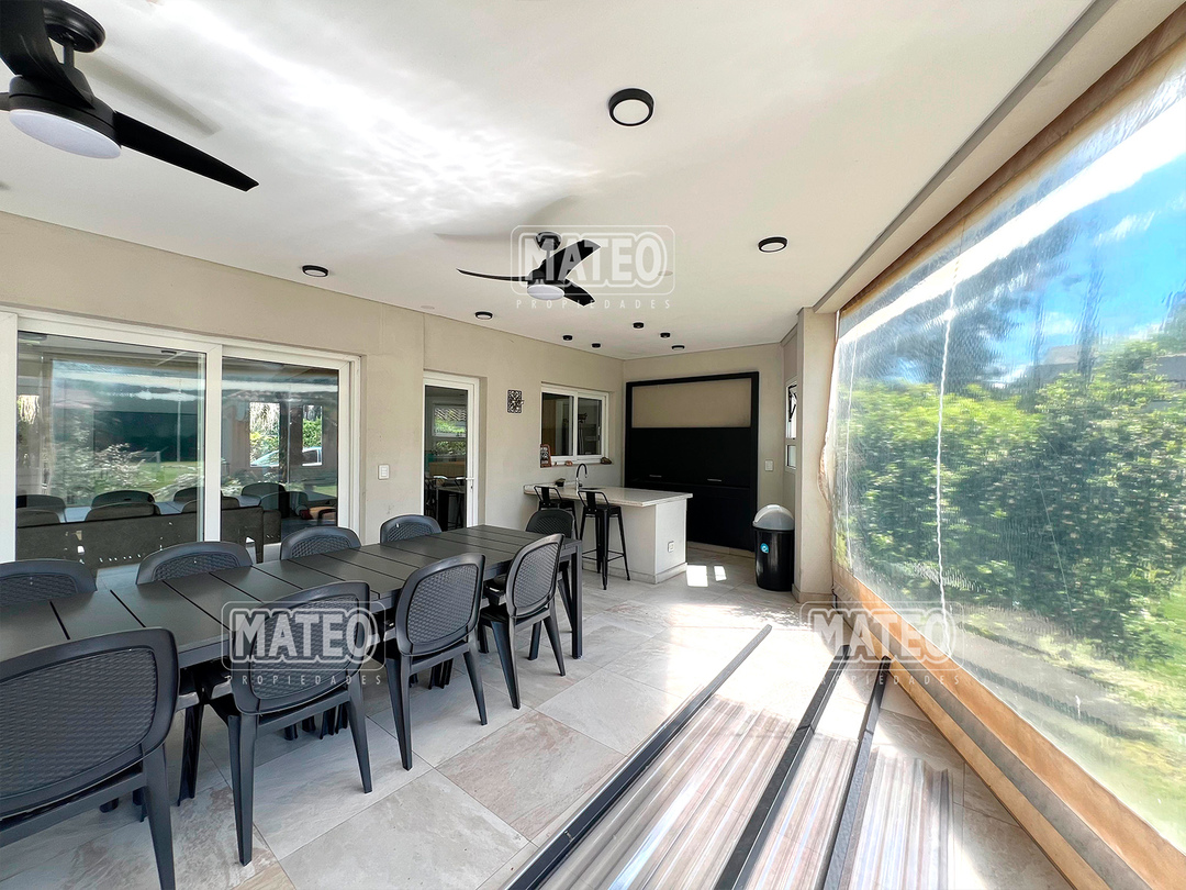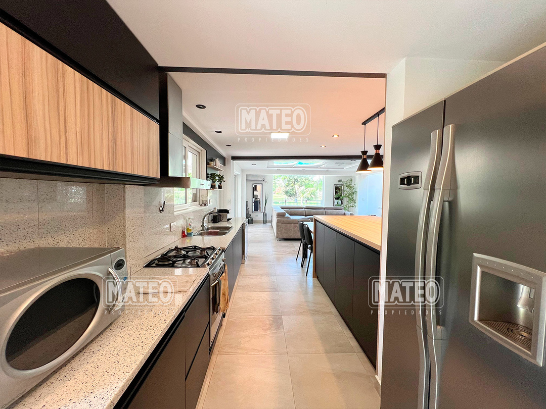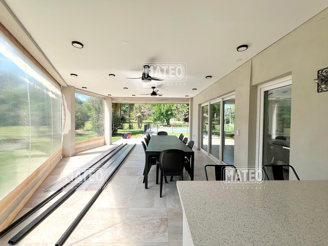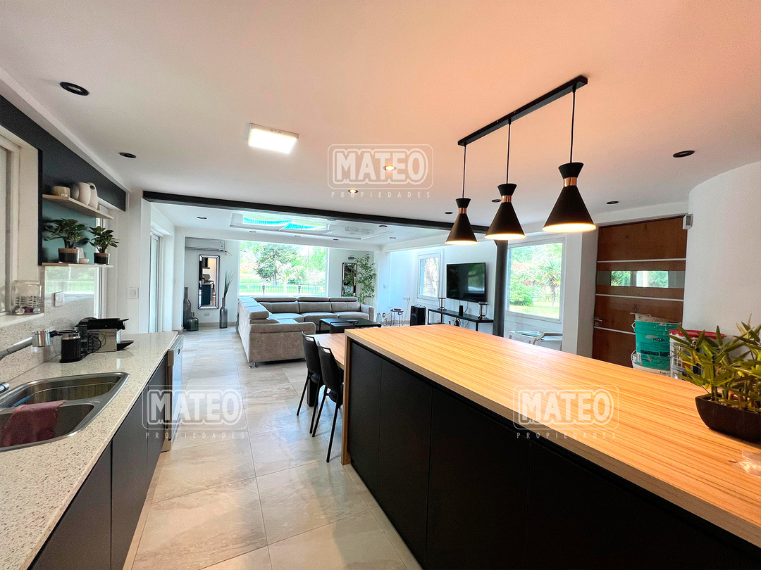 PLANTA BAJA: amplio living comedor con vistas abiertas al campo de Golf. Cocina comedor diario con moderno amueblamiento. Baño completo. Dos dormitorios (uno de ellos en suite). Lavadero interno. Quincho muy bien equipado, con barra, amplia parrilla, toldos cristal (transparente) para poder cerrar el ambiente. Piscina climatizada, con revestimiento de venecitas y playa húmeda. Jardín fondo Golf. PLANTA ALTA: tres dormitorios. Baño completo con hidromasajes. Mateo Propiedades. Mat. 203 Dpto. M-Gr.