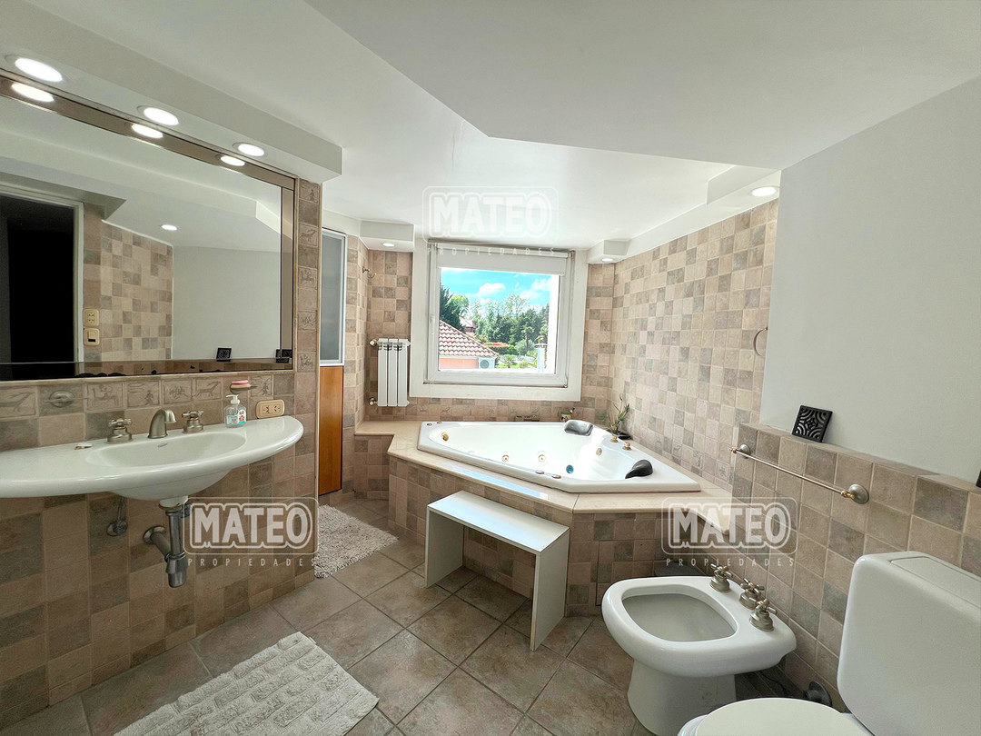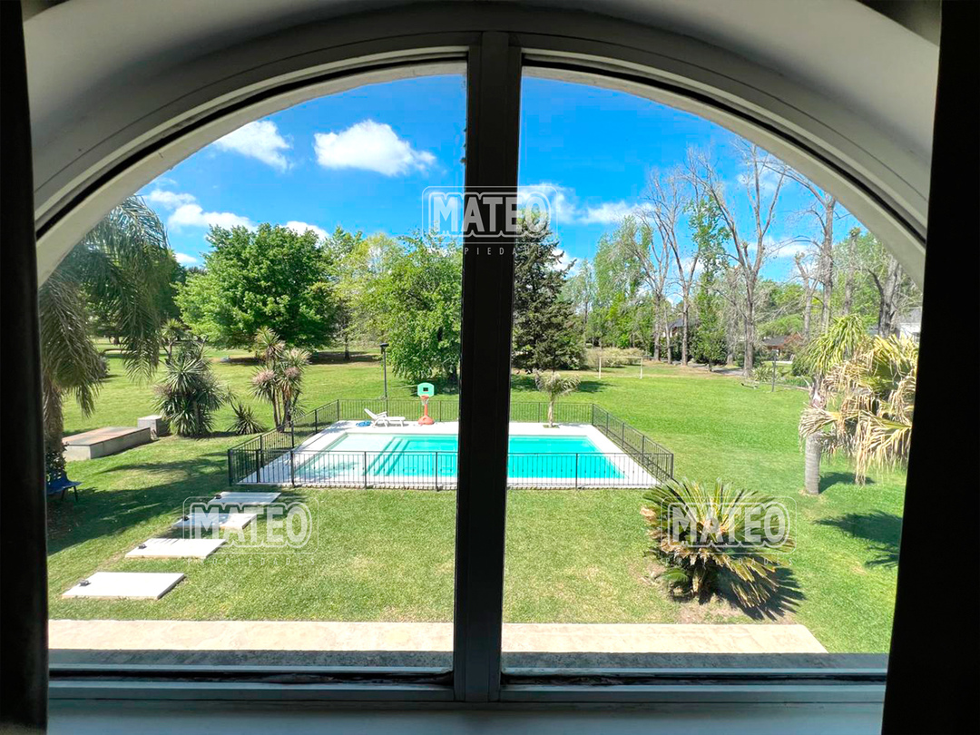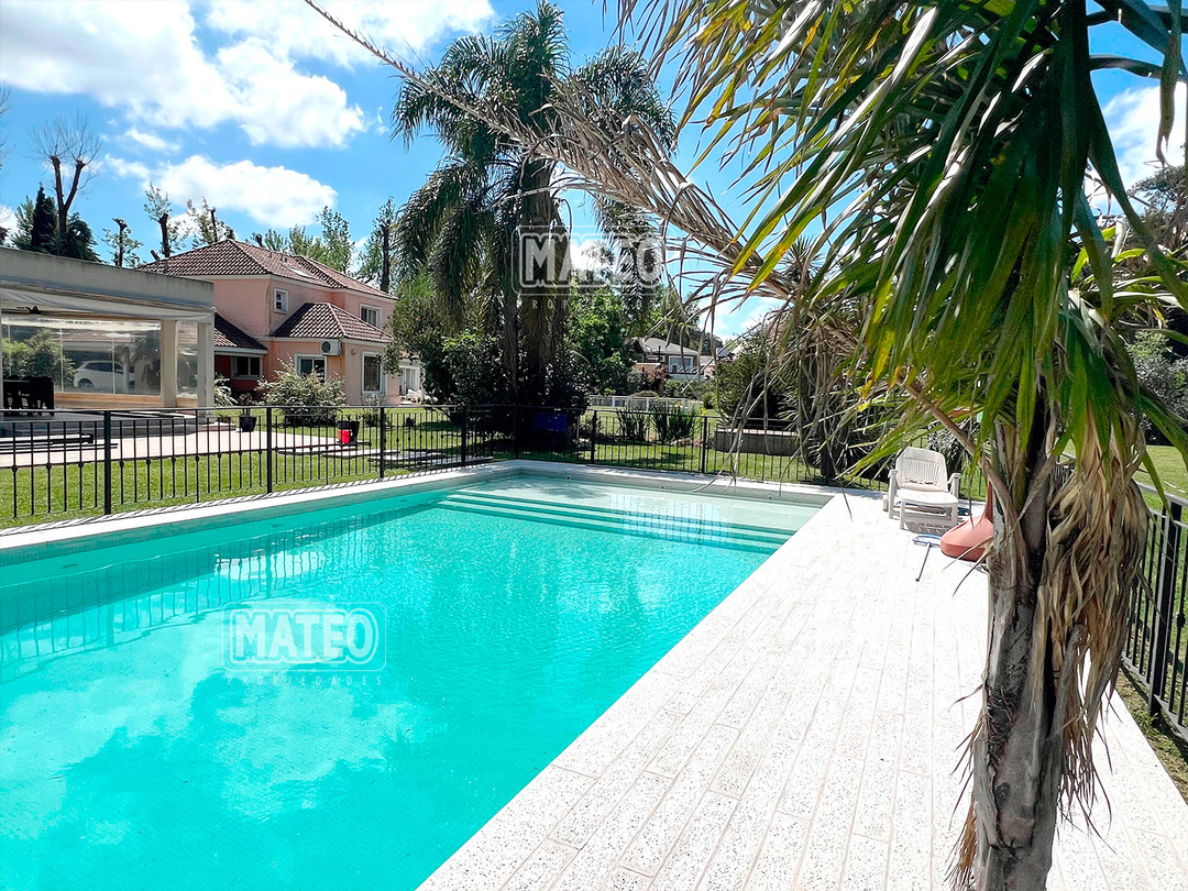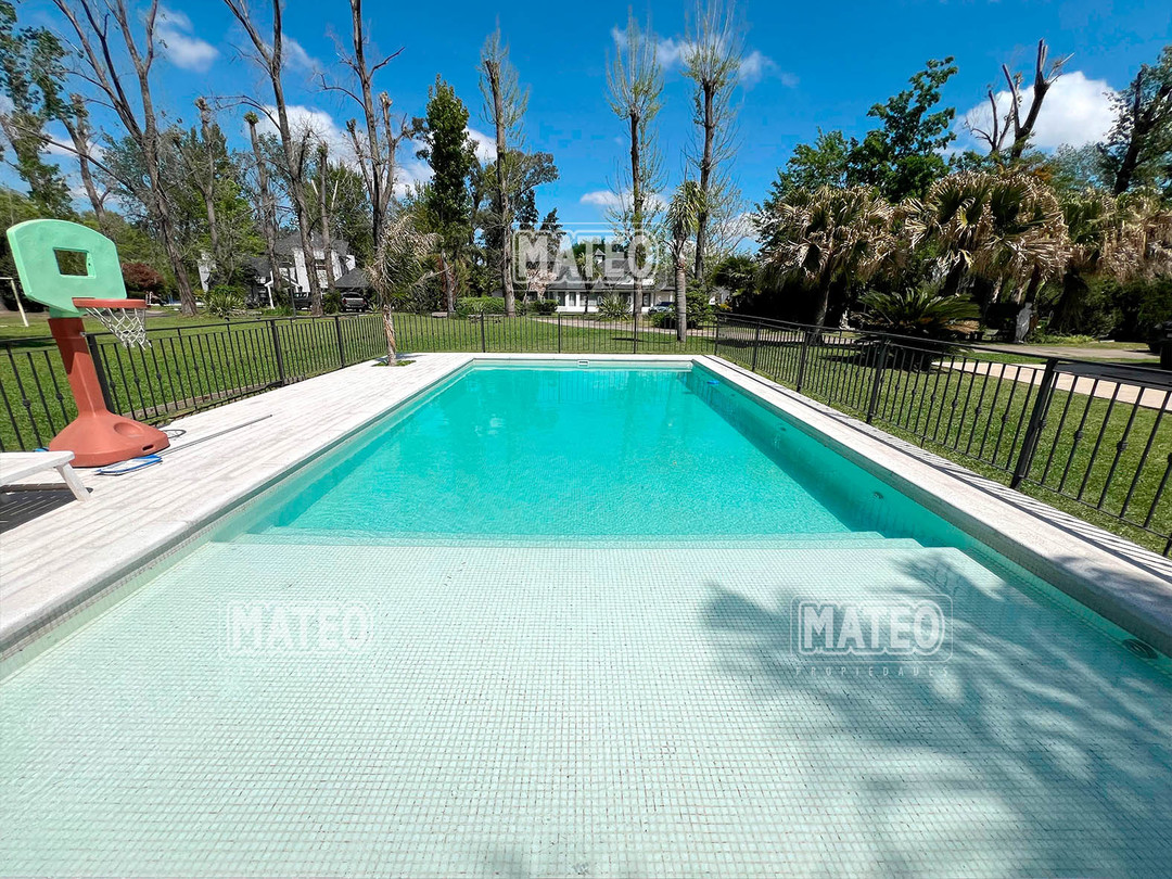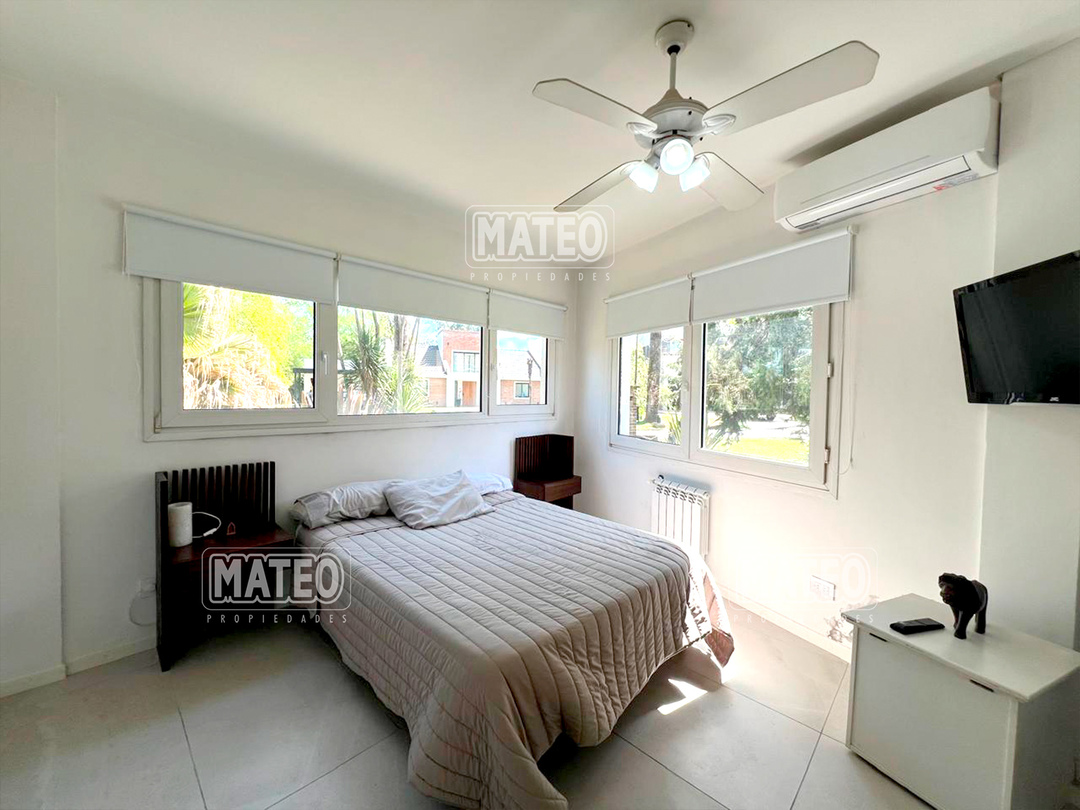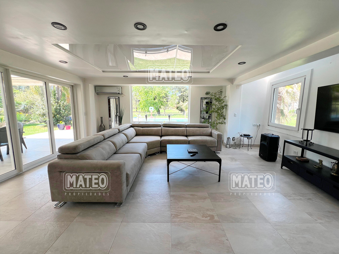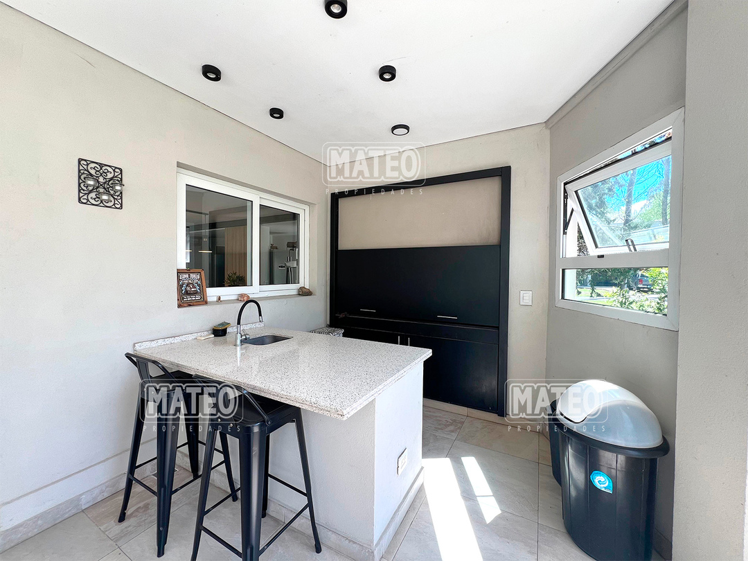 PLANTA BAJA: amplio living comedor con vistas abiertas al campo de Golf. Cocina comedor diario con moderno amueblamiento. Baño completo. Dos dormitorios (uno de ellos en suite). Lavadero interno. Quincho muy bien equipado, con barra, amplia parrilla, toldos cristal (transparente) para poder cerrar el ambiente. Piscina climatizada, con revestimiento de venecitas y playa húmeda. Jardín fondo Golf. PLANTA ALTA: tres dormitorios. Baño completo con hidromasajes. Mateo Propiedades. Mat. 203 Dpto. M-Gr.