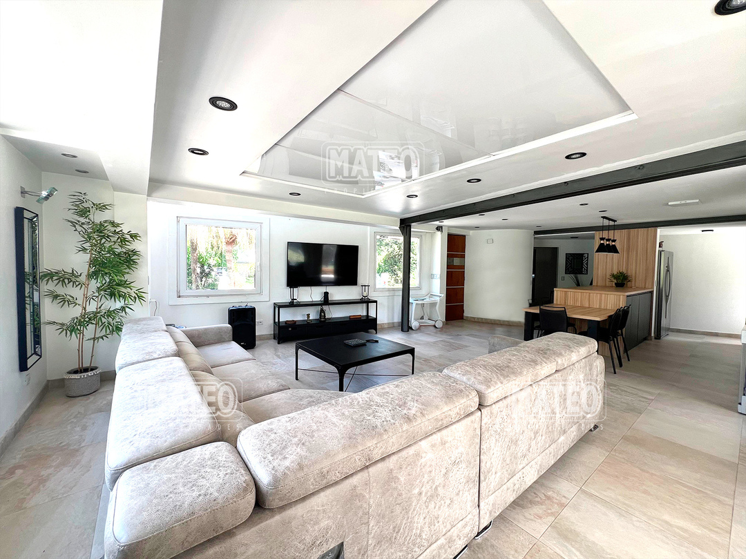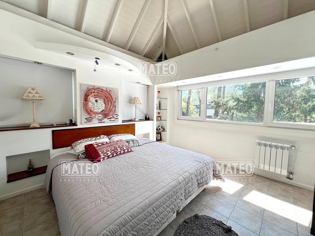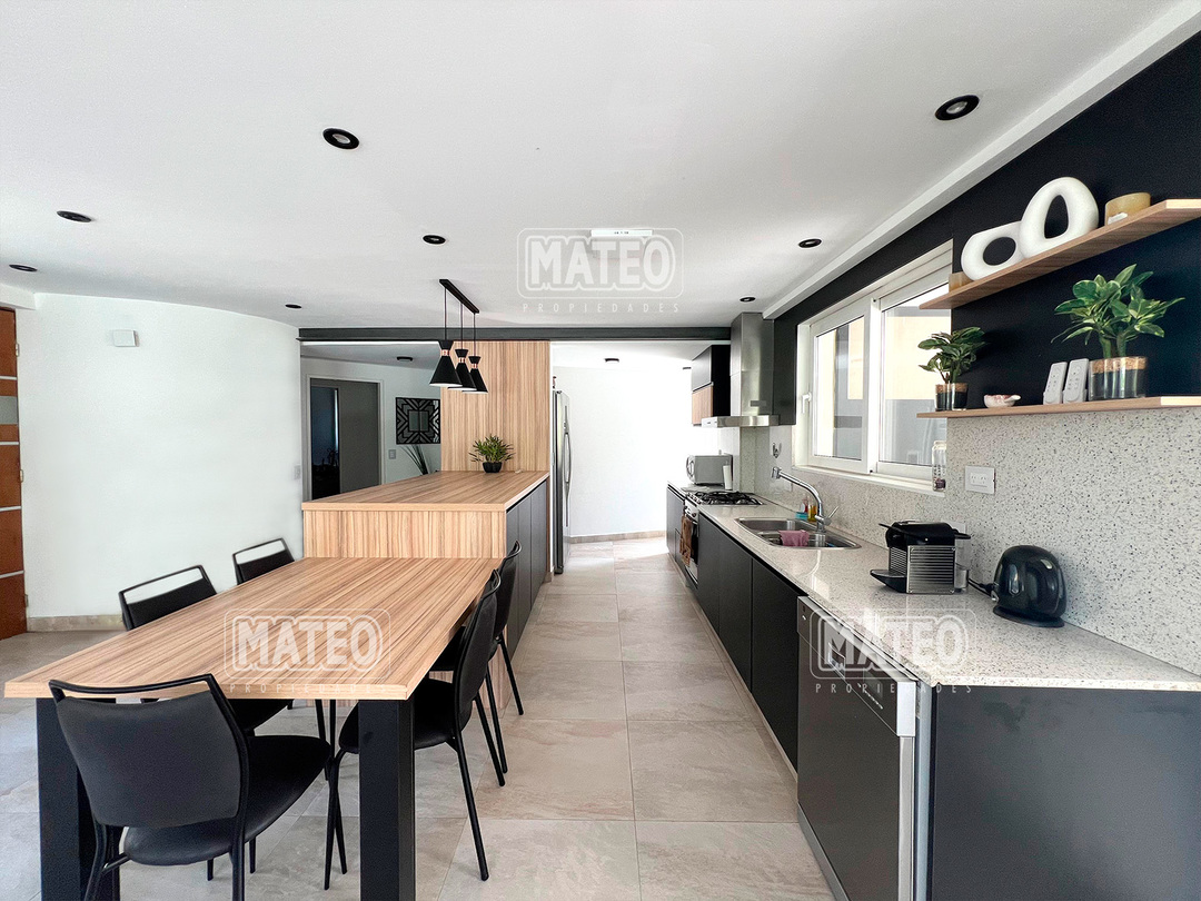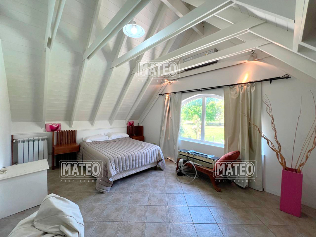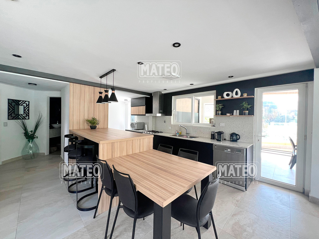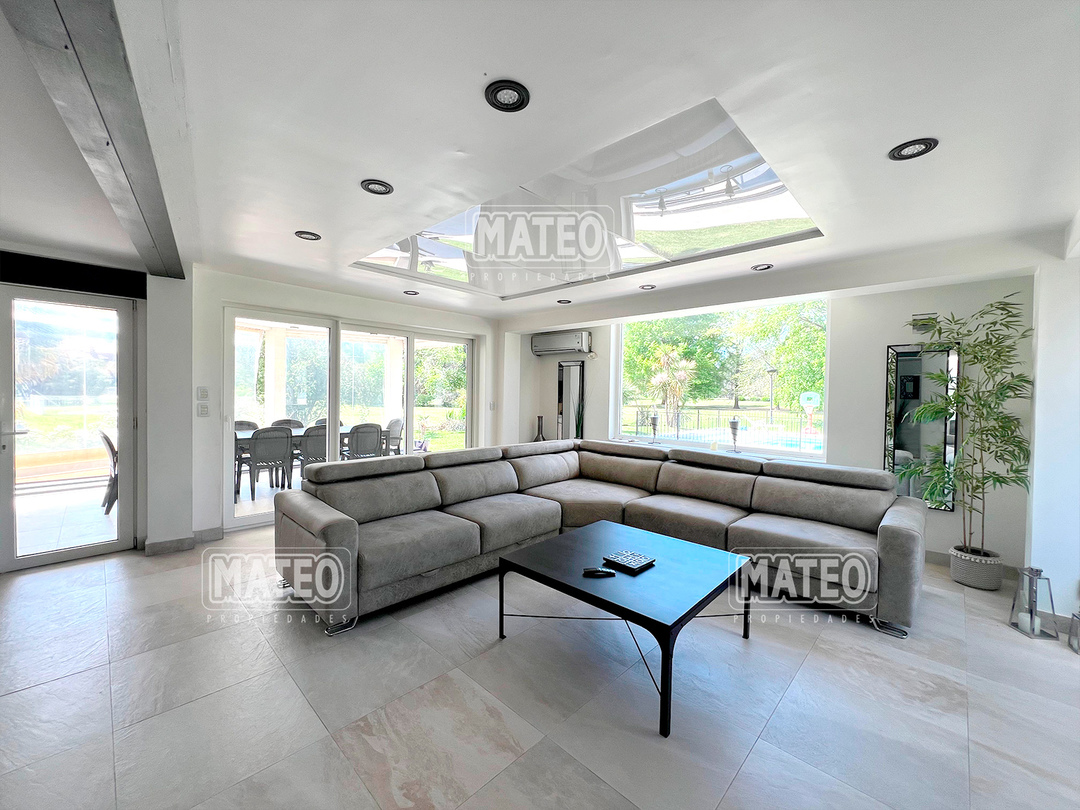 PLANTA BAJA: amplio living comedor con vistas abiertas al campo de Golf. Cocina comedor diario con moderno amueblamiento. Baño completo. Dos dormitorios (uno de ellos en suite). Lavadero interno. Quincho muy bien equipado, con barra, amplia parrilla, toldos cristal (transparente) para poder cerrar el ambiente. Piscina climatizada, con revestimiento de venecitas y playa húmeda. Jardín fondo Golf. PLANTA ALTA: tres dormitorios. Baño completo con hidromasajes. Mateo Propiedades. Mat. 203 Dpto. M-Gr.