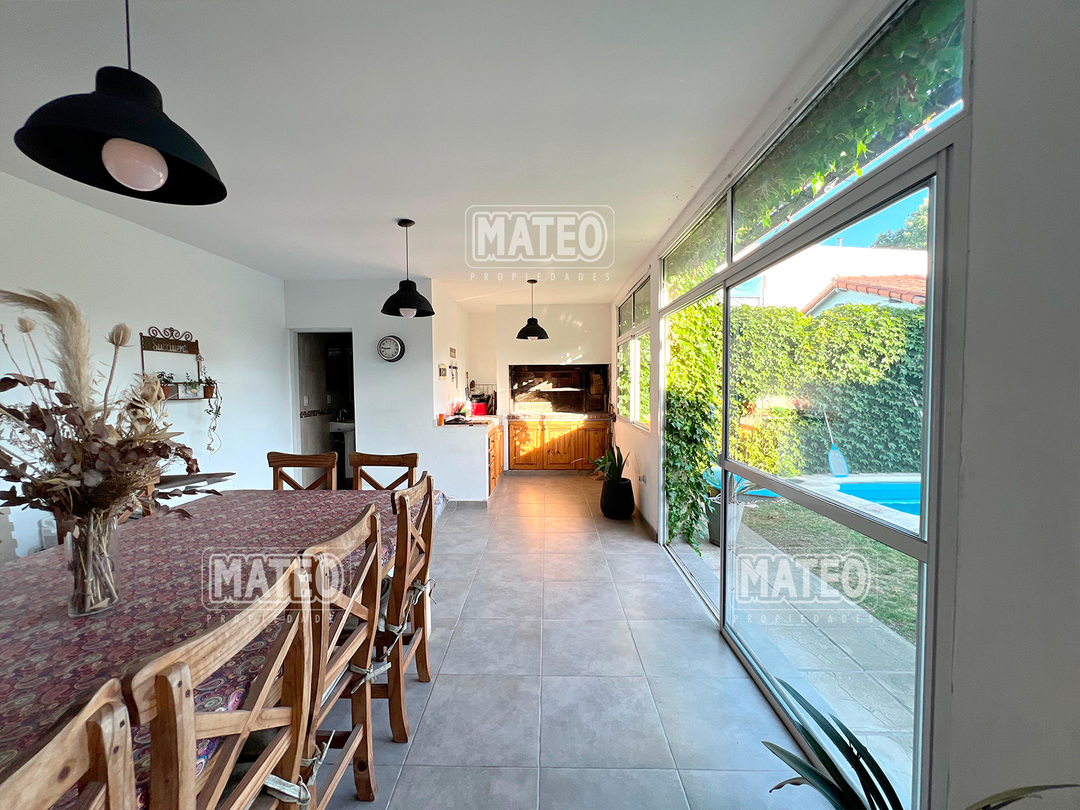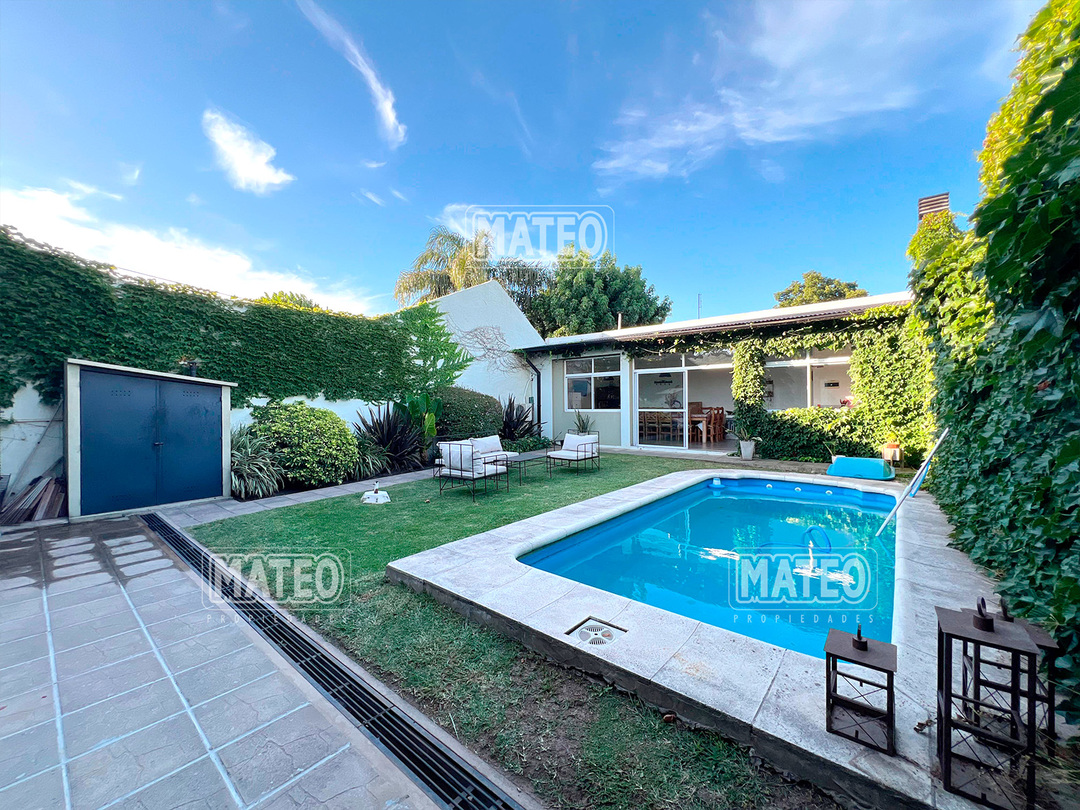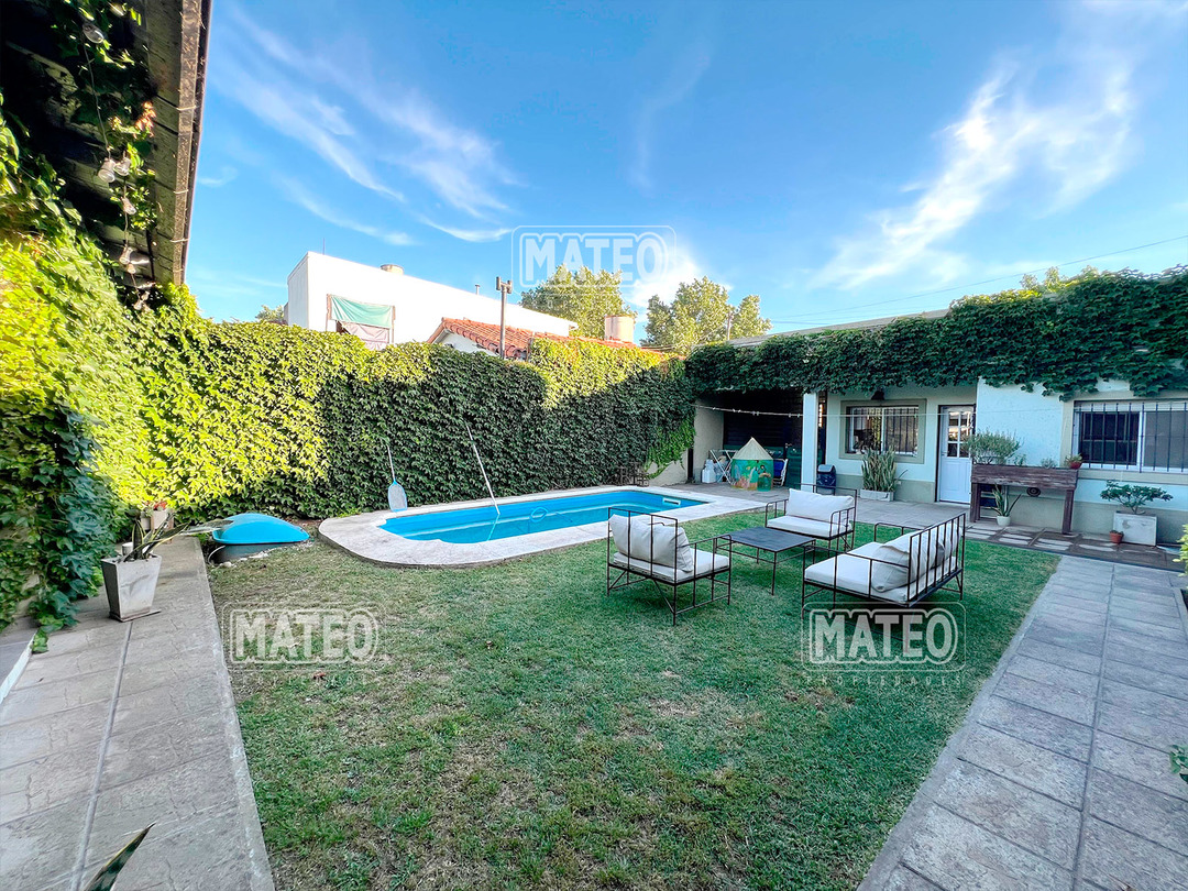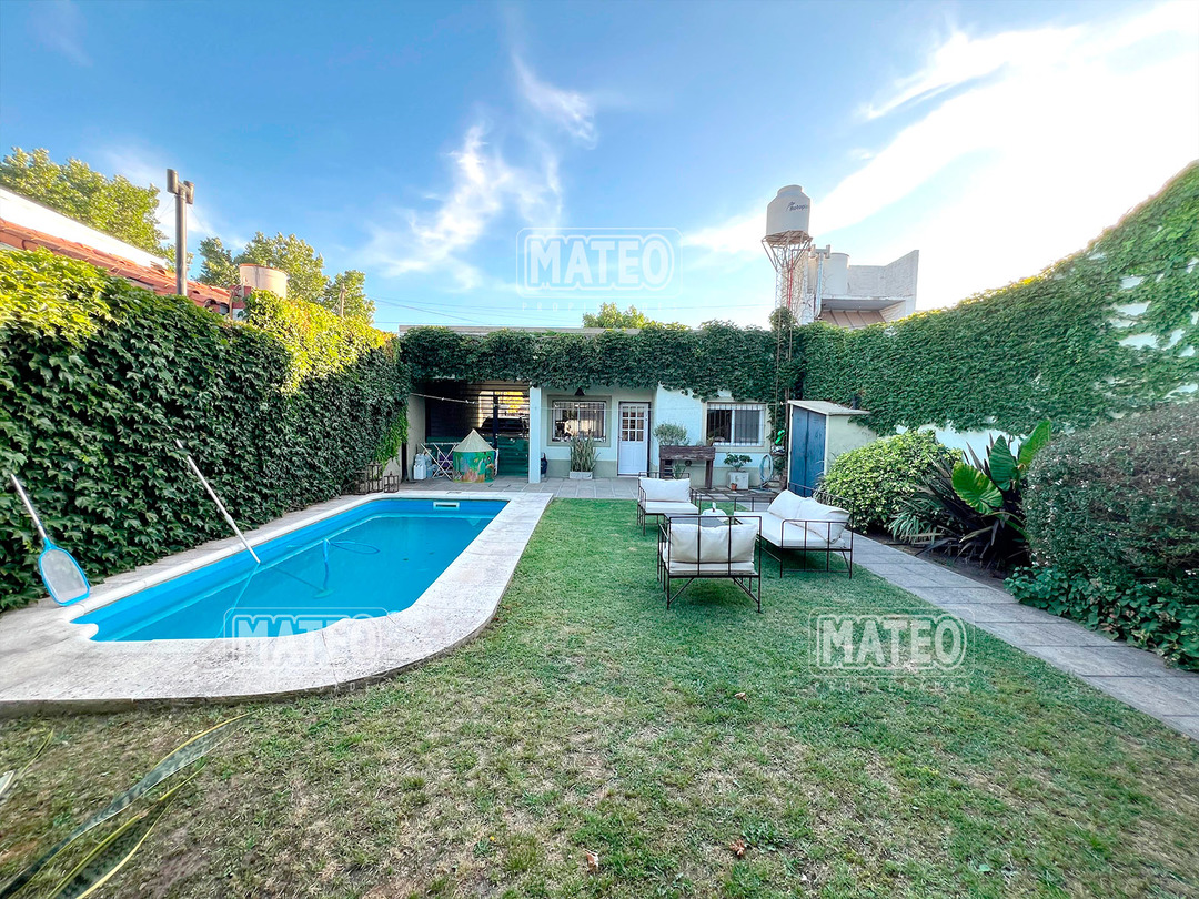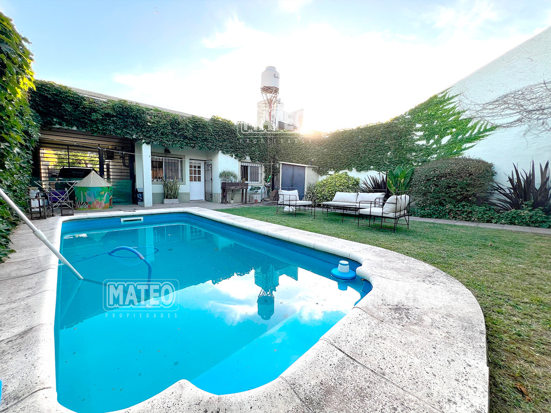 Paso del Rey, lado sur. Ocho cuadras de la estación. Todos los servicios. Propiedad construida en planta baja, con muy buen nivel constructivo, y excelente estado de mantenimiento. Patio delantero y hall recibidor. Living comedor. Cocina semi integrada, con moderno amueblamiento. Dos amplios dormitorios con placar. Baño completo. Hermoso jardín trasero. Quincho cerrado de amplias dimensiones, muy bien equipado y con baño completo. Piscina de fibra de vidrio, con su equipo completo de filtrado y bomba. Garaje cubierto para dos vehículos, portón vehicular automatizado. CARACTERISTICAS GENERALES: Calefacción por tiro balanceado y Splits frio-calor. Mat. 36 Dpto. M-Gr.