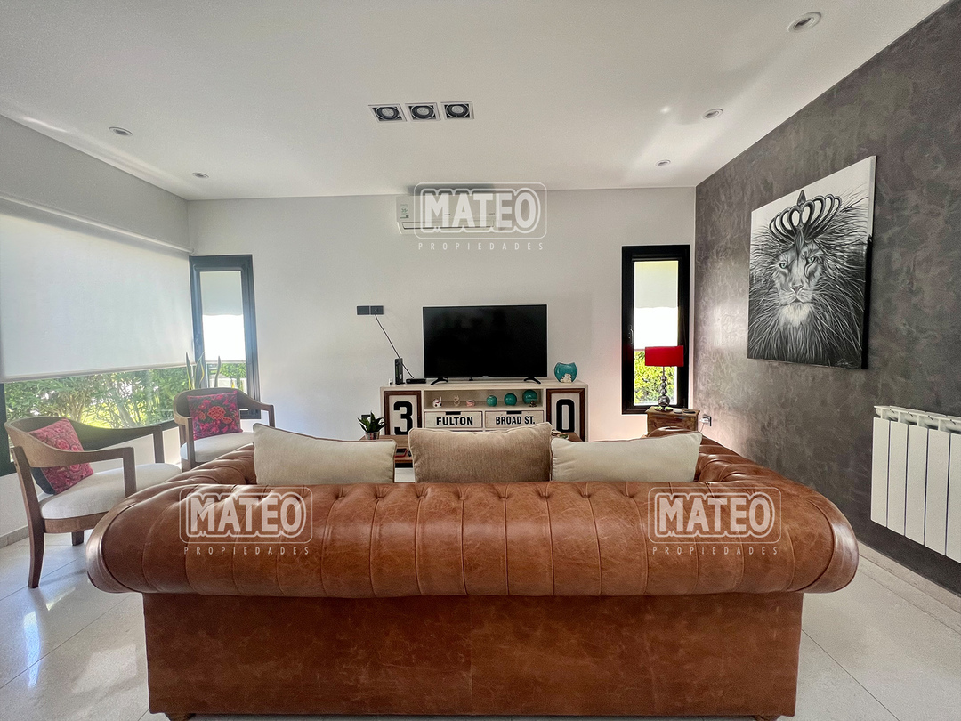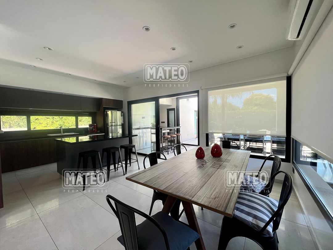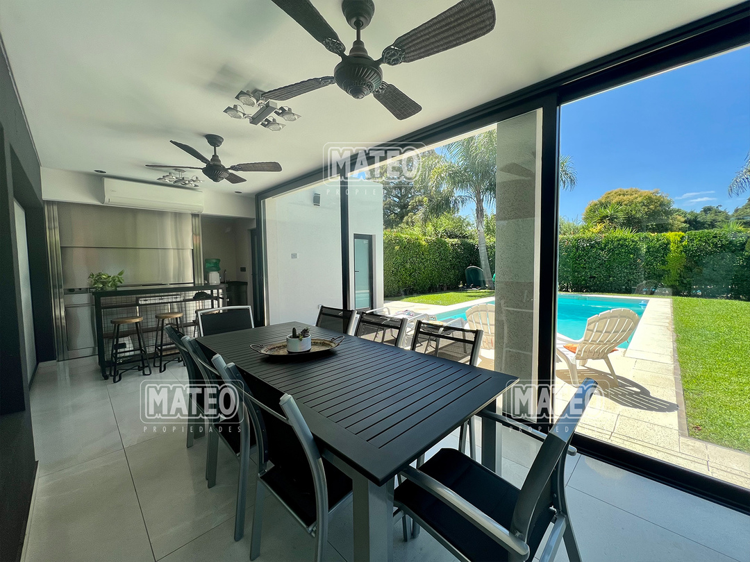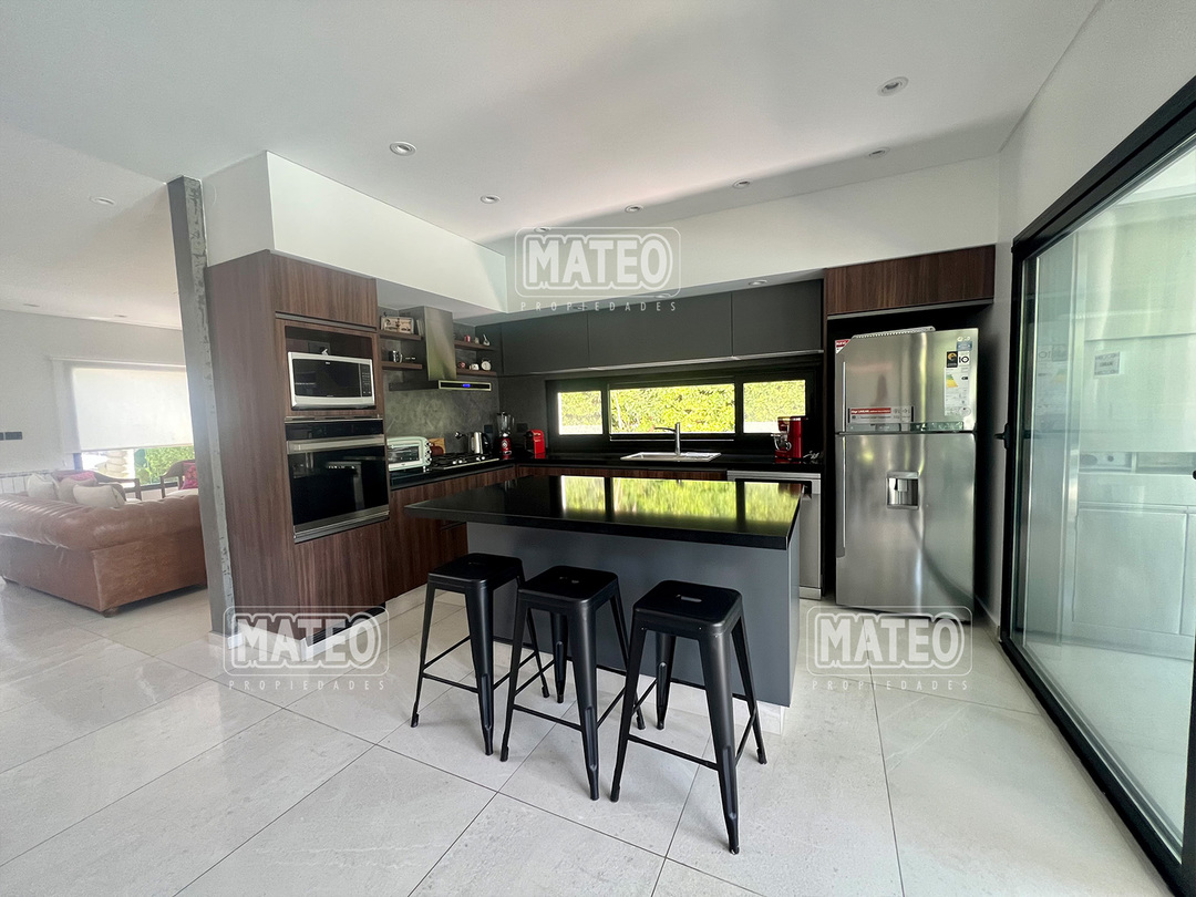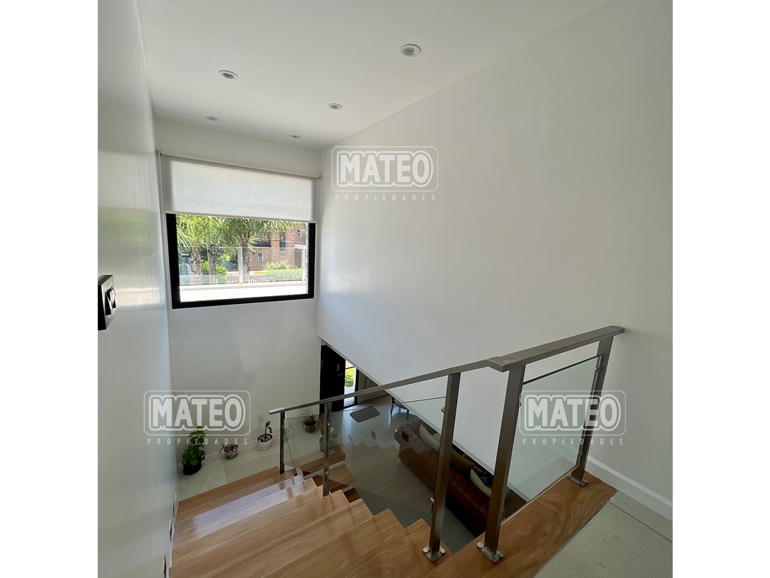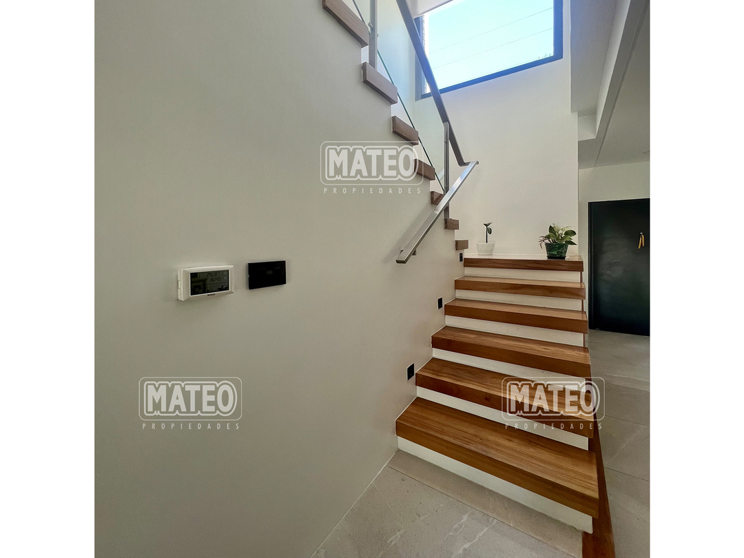 MODERNA PROPIEDAD CON EXCELENTE NIVEL DE TERMINACIONES En Planta baja cuenta con un luminoso living, toillete de recepción, moderna cocina con mobiliario jonsohn de excelente calidad, horno empotrado marca Ariston, anafe a gas, campana extractora de acero inoxidable, lavavajillas, isla central, luminoso comedor diario. A continuación cuenta con un práctico y super luminoso quincho cerrado con aberturas de vidrio DVH de pared a pared, parrilla con tapa y puertas de acero inoxidable. con sector a carbon y sector a gas. Ladero y baño para abastecer el exterior. Garage semi cubierto para 2 vehiculos. En Planta Alta cuenta con 4 Dormitorios todos con salida a balcon corrido (una master suite con vestidor, baño en suite revestido en porcelanato calacata. Los otros tres dormitorios cuentan con placards de piso a techo y comparten un baño completo. En el exterior piscina con climatizador y amplio solarium. Cesped de grama bahiana y parquización con palmeras. Riego. Terminaciones: Calefaccion por radiadores, todos los ambientes cuentan con aire acondicionado individual, revestimiento de pisos y baños marca Ilva. MObiliario de cocina Jonsohn, Aberturas doble vidrio en toda la casa. Barandas en terrazas de blindex. Revestimiento exterior Tarquini, pintura interior satinada. Todas las terminaciones de excelente calidad. La casa se entrega con todas las luces, ventiladores, aires, cortinas. Excelente valor en función de su calidad y nivel de terminaciones. No deje de coordinar su visita. - Mat 36 Moreno - Gral Rodriguez.