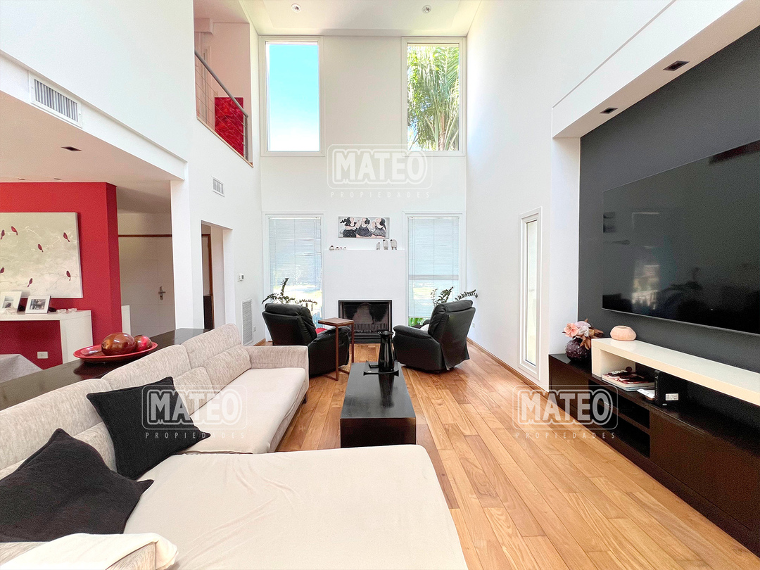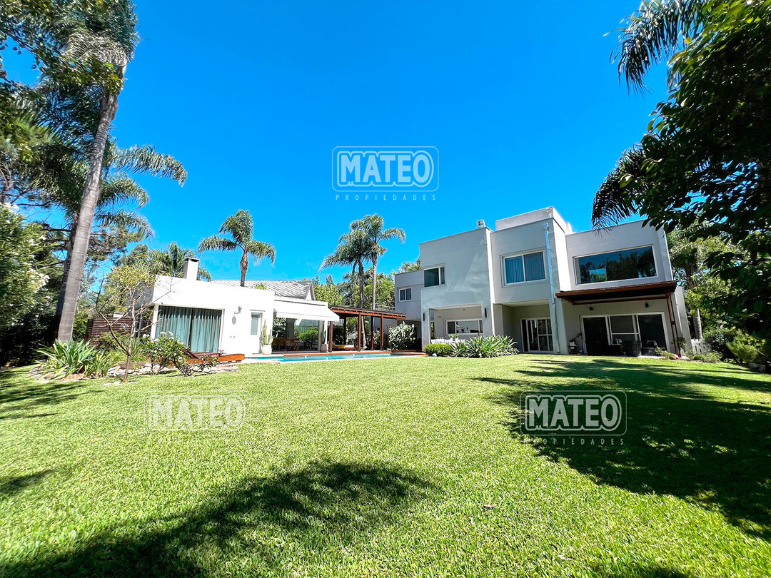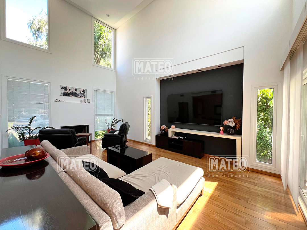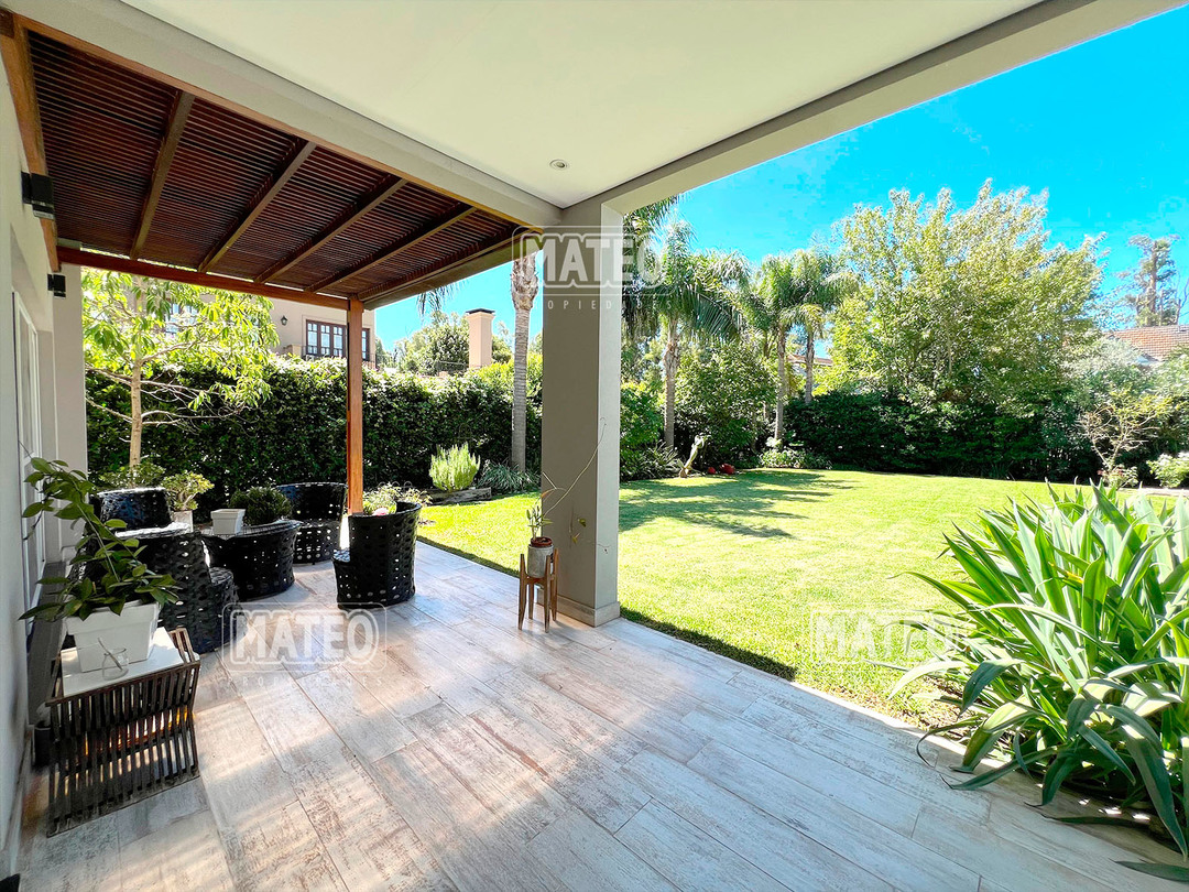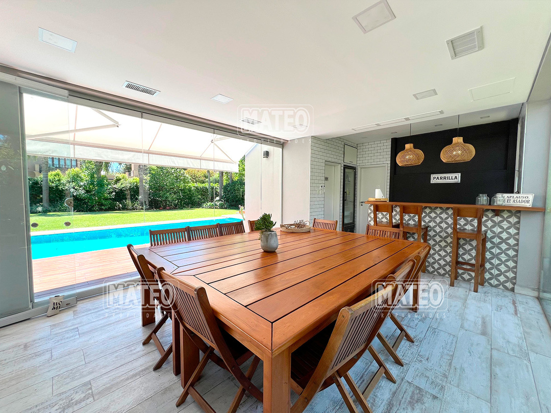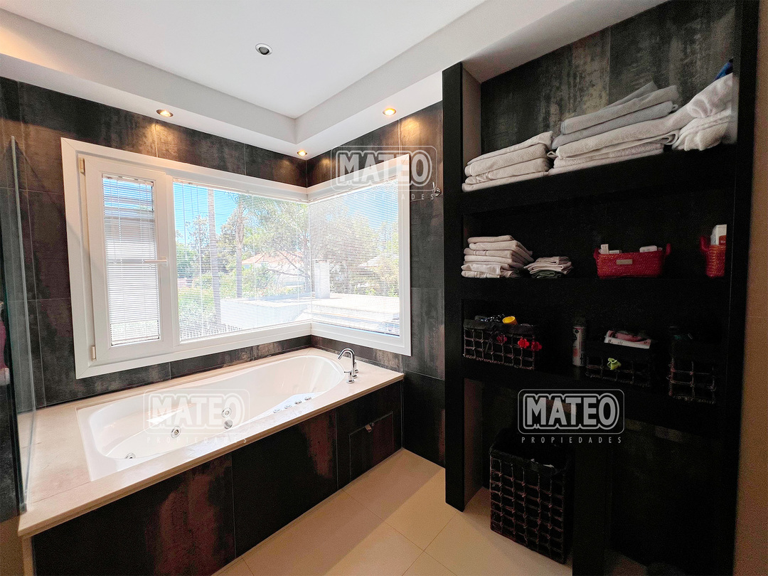 PLANTA BAJA: Hall de recepción. Amplio y luminoso living comedor en doble altura y con hogar a leña. Cocina comedor con isla central. Estudio. Baño completo compartimentado. Dependencia de servicio, con baño completo. Lavadero. Amplia galería. Quincho muy bien equipado, con cerramientos de blindex (sistema de paneles plegables que da la posibilidad de abrir hacia el jardín), con baño completo, sauna y ambiente para sala de masajes. Pérgola para estar exterior. Garaje cubierto para dos autos. Piscina con revestimiento de venecitas y sector de playa húmeda. Deck con excelente madera dura. PLANTA ALTA: Estar intimo que balconea el living. Dormitorio principal en suite con amplio vestidor, baño compartimentado, box de ducha e hidromasajes. Dos amplios dormitorios con placar (uno de ellos con balcón). Segundo baño completo con bañera. SUBSUELO: vinoteca. - Mateo Propiedades. Mat. 36 Dpto. M-Gr.