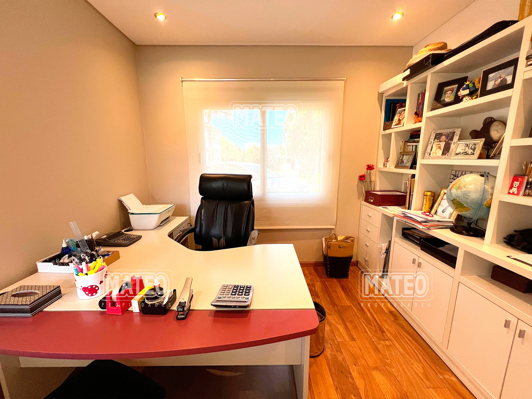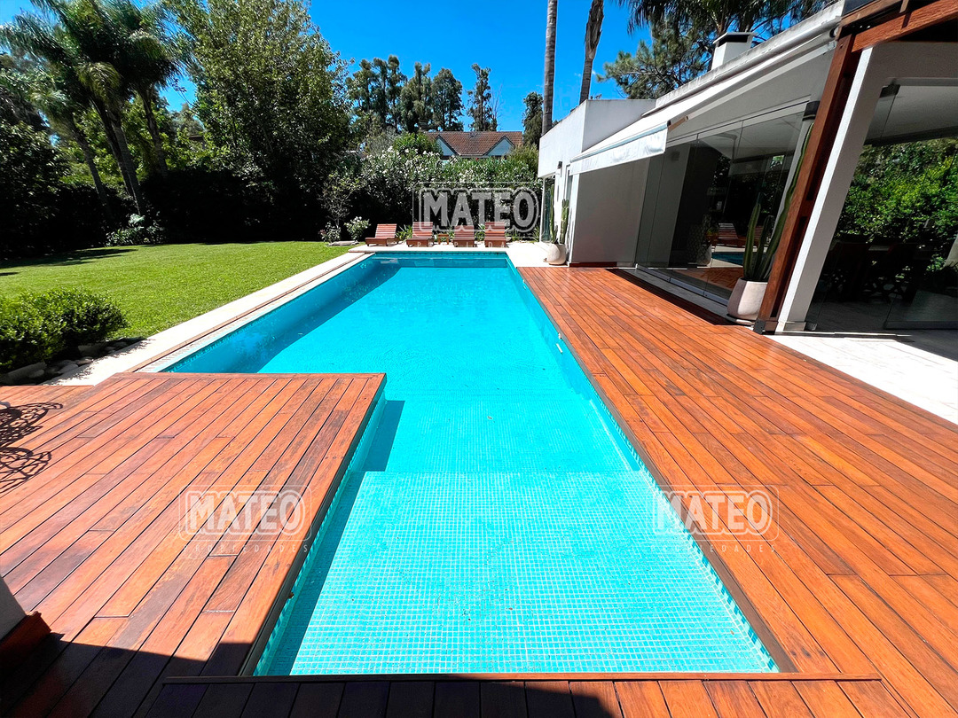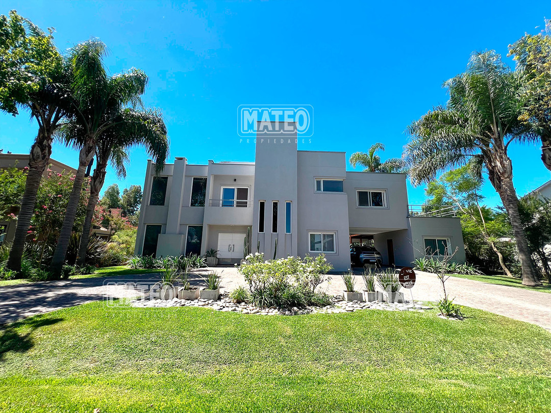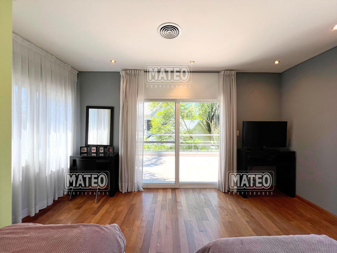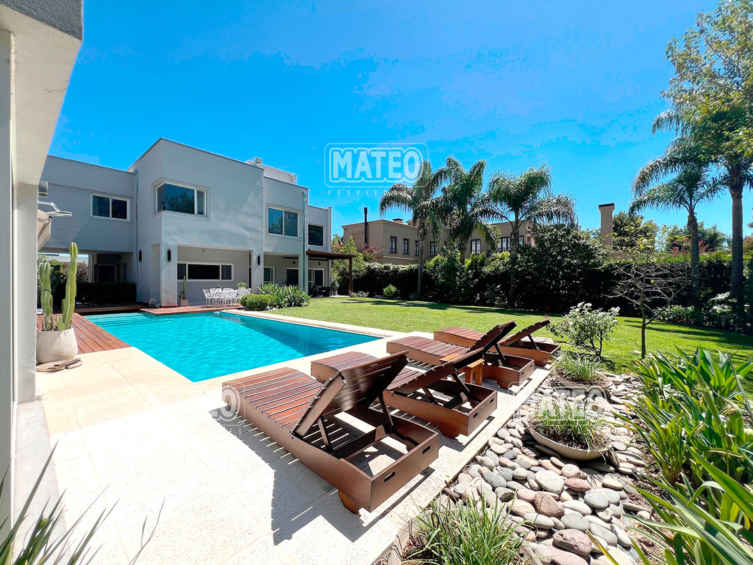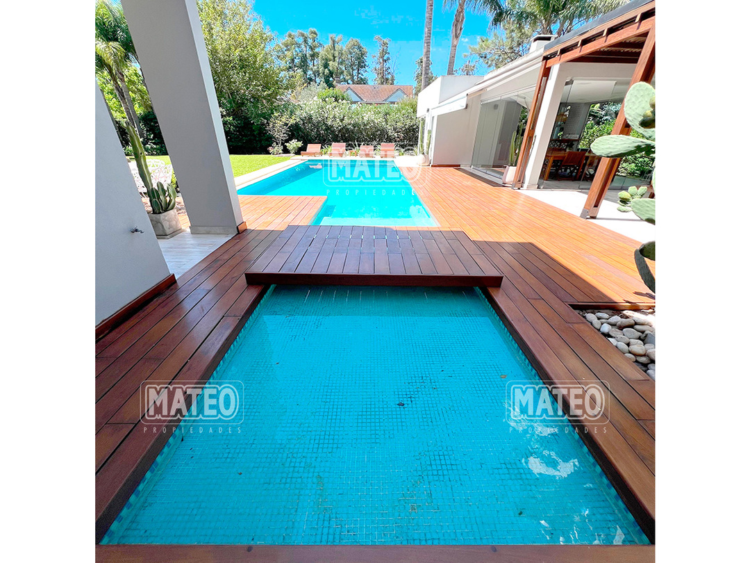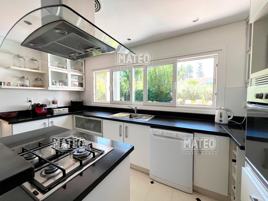 PLANTA BAJA: Hall de recepción. Amplio y luminoso living comedor en doble altura y con hogar a leña. Cocina comedor con isla central. Estudio. Baño completo compartimentado. Dependencia de servicio, con baño completo. Lavadero. Amplia galería. Quincho muy bien equipado, con cerramientos de blindex (sistema de paneles plegables que da la posibilidad de abrir hacia el jardín), con baño completo, sauna y ambiente para sala de masajes. Pérgola para estar exterior. Garaje cubierto para dos autos. Piscina con revestimiento de venecitas y sector de playa húmeda. Deck con excelente madera dura. PLANTA ALTA: Estar intimo que balconea el living. Dormitorio principal en suite con amplio vestidor, baño compartimentado, box de ducha e hidromasajes. Dos amplios dormitorios con placar (uno de ellos con balcón). Segundo baño completo con bañera. SUBSUELO: vinoteca. - Mateo Propiedades. Mat. 36 Dpto. M-Gr.