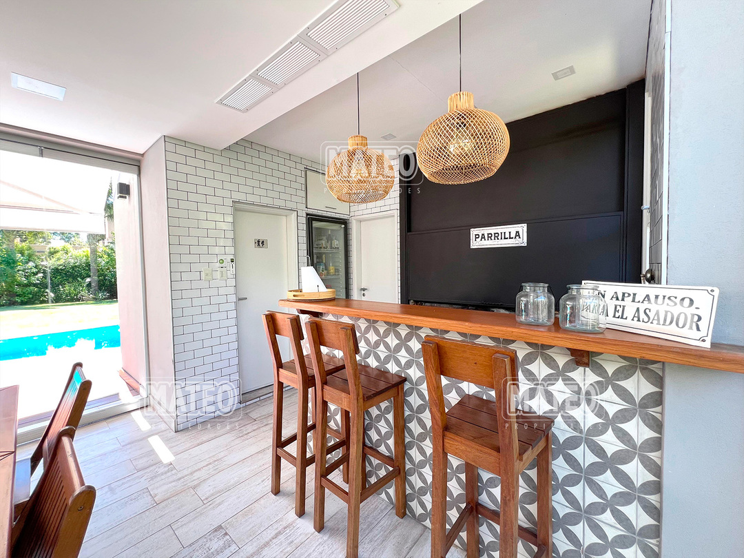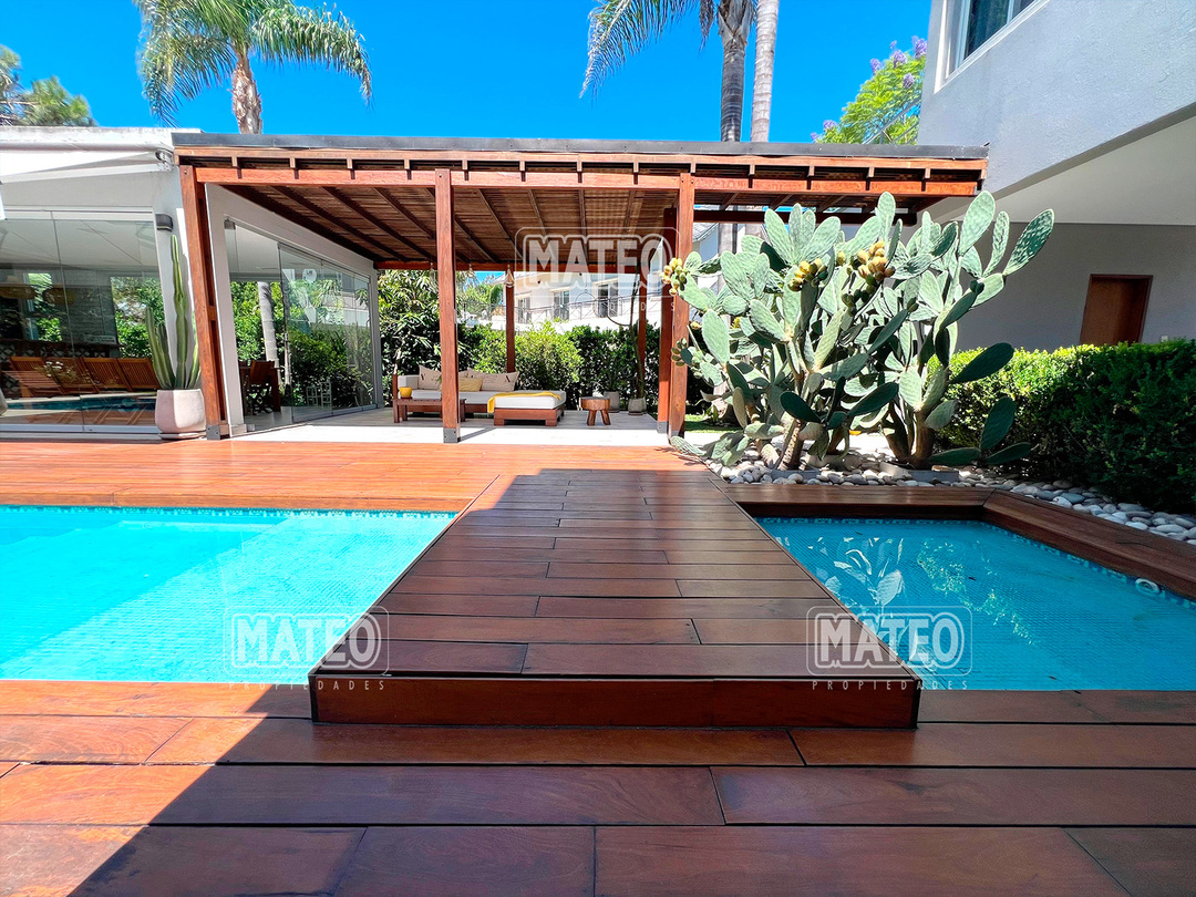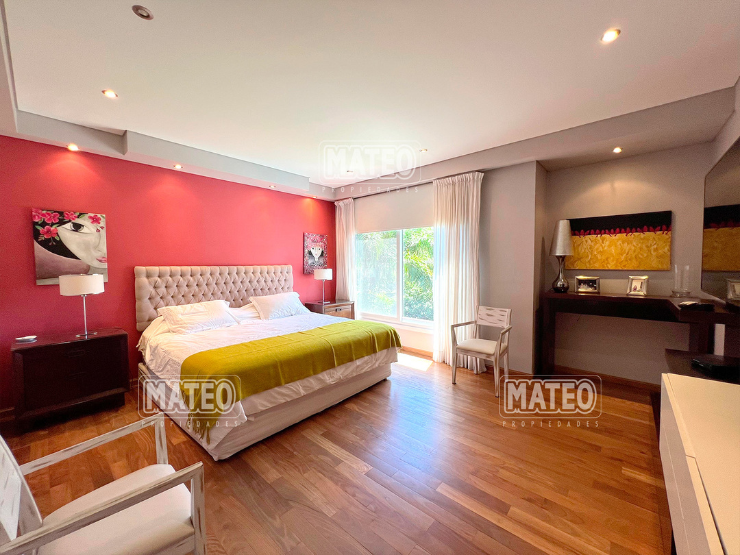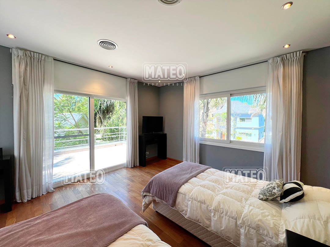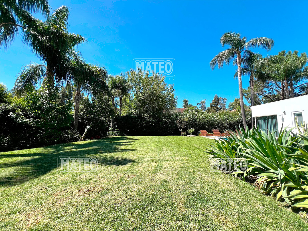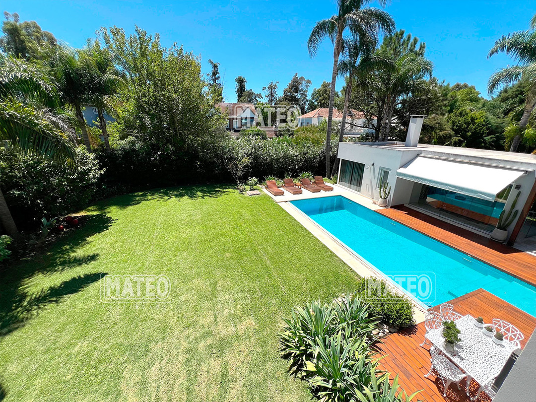 PLANTA BAJA: Hall de recepción. Amplio y luminoso living comedor en doble altura y con hogar a leña. Cocina comedor con isla central. Estudio. Baño completo compartimentado. Dependencia de servicio, con baño completo. Lavadero. Amplia galería. Quincho muy bien equipado, con cerramientos de blindex (sistema de paneles plegables que da la posibilidad de abrir hacia el jardín), con baño completo, sauna y ambiente para sala de masajes. Pérgola para estar exterior. Garaje cubierto para dos autos. Piscina con revestimiento de venecitas y sector de playa húmeda. Deck con excelente madera dura. PLANTA ALTA: Estar intimo que balconea el living. Dormitorio principal en suite con amplio vestidor, baño compartimentado, box de ducha e hidromasajes. Dos amplios dormitorios con placar (uno de ellos con balcón). Segundo baño completo con bañera. SUBSUELO: vinoteca. - Mateo Propiedades. Mat. 36 Dpto. M-Gr.