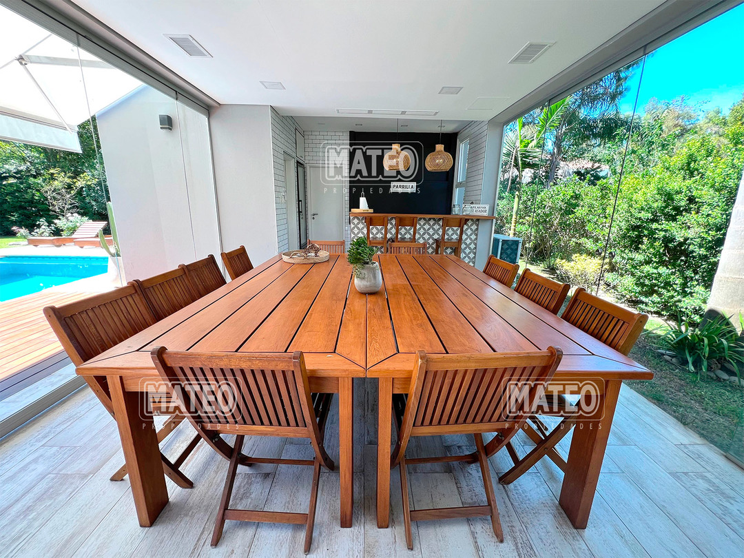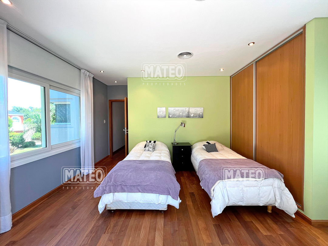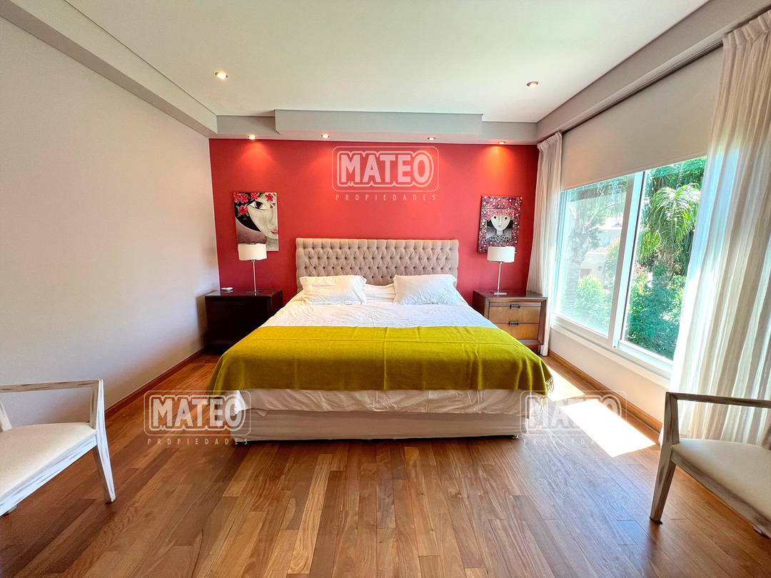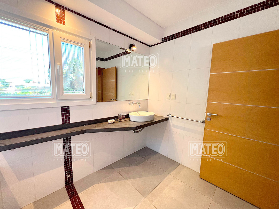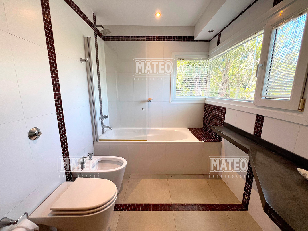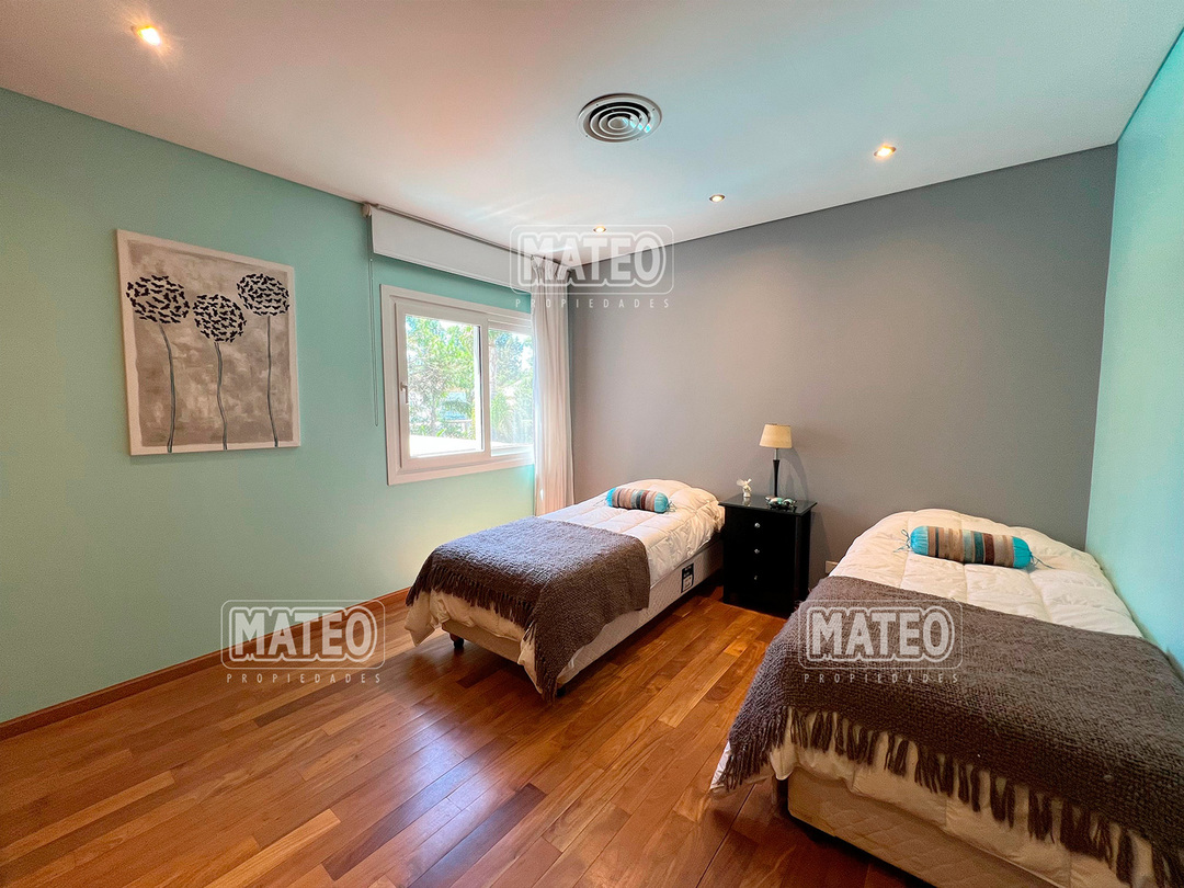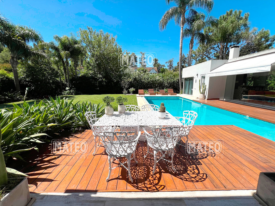 PLANTA BAJA: Hall de recepción. Amplio y luminoso living comedor en doble altura y con hogar a leña. Cocina comedor con isla central. Estudio. Baño completo compartimentado. Dependencia de servicio, con baño completo. Lavadero. Amplia galería. Quincho muy bien equipado, con cerramientos de blindex (sistema de paneles plegables que da la posibilidad de abrir hacia el jardín), con baño completo, sauna y ambiente para sala de masajes. Pérgola para estar exterior. Garaje cubierto para dos autos. Piscina con revestimiento de venecitas y sector de playa húmeda. Deck con excelente madera dura. PLANTA ALTA: Estar intimo que balconea el living. Dormitorio principal en suite con amplio vestidor, baño compartimentado, box de ducha e hidromasajes. Dos amplios dormitorios con placar (uno de ellos con balcón). Segundo baño completo con bañera. SUBSUELO: vinoteca. - Mateo Propiedades. Mat. 36 Dpto. M-Gr.