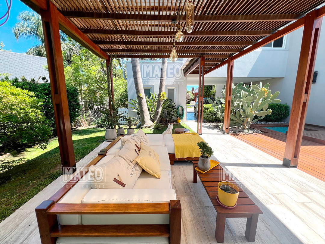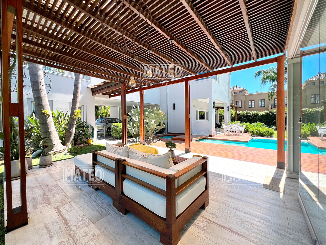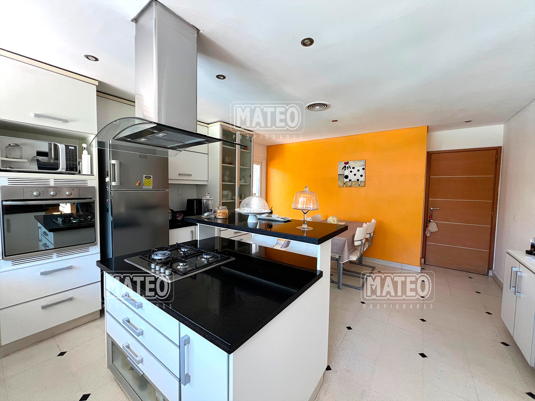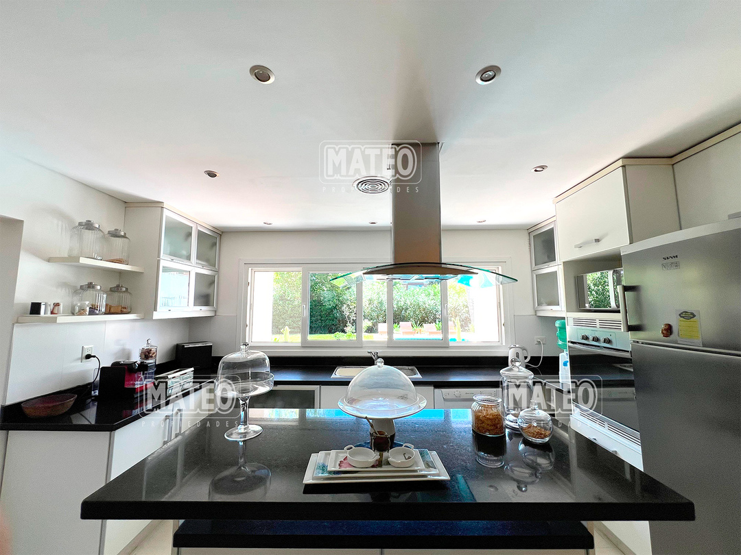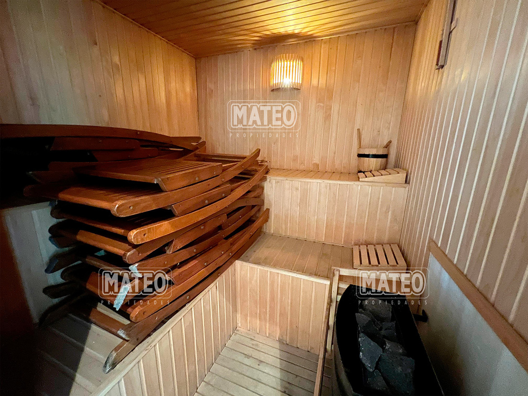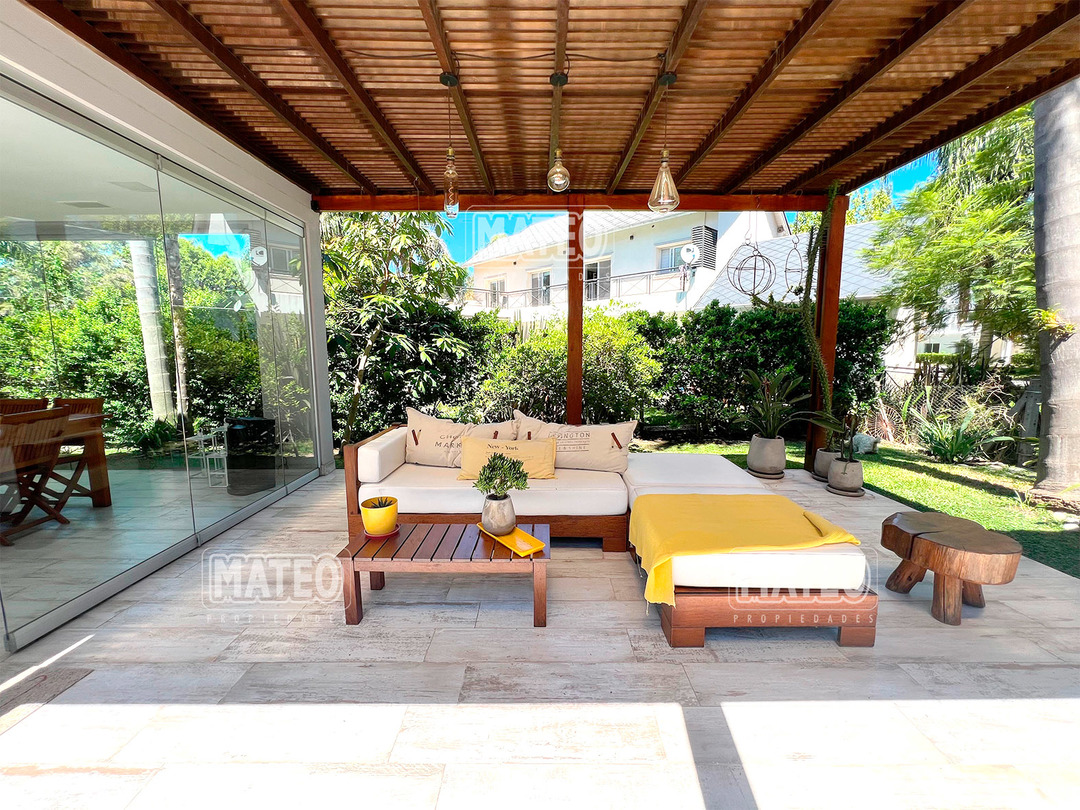 PLANTA BAJA: Hall de recepción. Amplio y luminoso living comedor en doble altura y con hogar a leña. Cocina comedor con isla central. Estudio. Baño completo compartimentado. Dependencia de servicio, con baño completo. Lavadero. Amplia galería. Quincho muy bien equipado, con cerramientos de blindex (sistema de paneles plegables que da la posibilidad de abrir hacia el jardín), con baño completo, sauna y ambiente para sala de masajes. Pérgola para estar exterior. Garaje cubierto para dos autos. Piscina con revestimiento de venecitas y sector de playa húmeda. Deck con excelente madera dura. PLANTA ALTA: Estar intimo que balconea el living. Dormitorio principal en suite con amplio vestidor, baño compartimentado, box de ducha e hidromasajes. Dos amplios dormitorios con placar (uno de ellos con balcón). Segundo baño completo con bañera. SUBSUELO: vinoteca. - Mateo Propiedades. Mat. 36 Dpto. M-Gr.